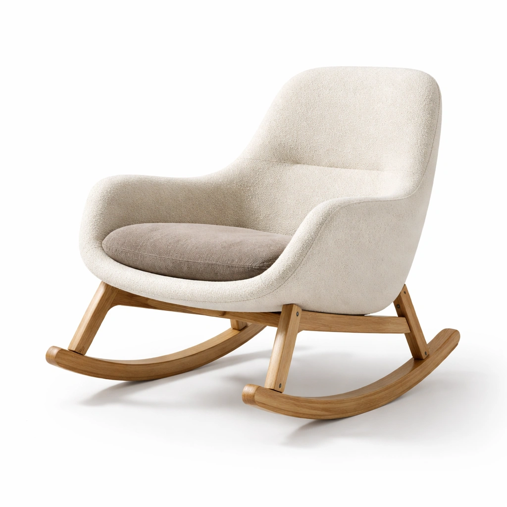 Der Schaukelstuhl bietet Komfort mit einem Rahmen aus Eichenholz und einem Sitz aus Polyesterstoff.